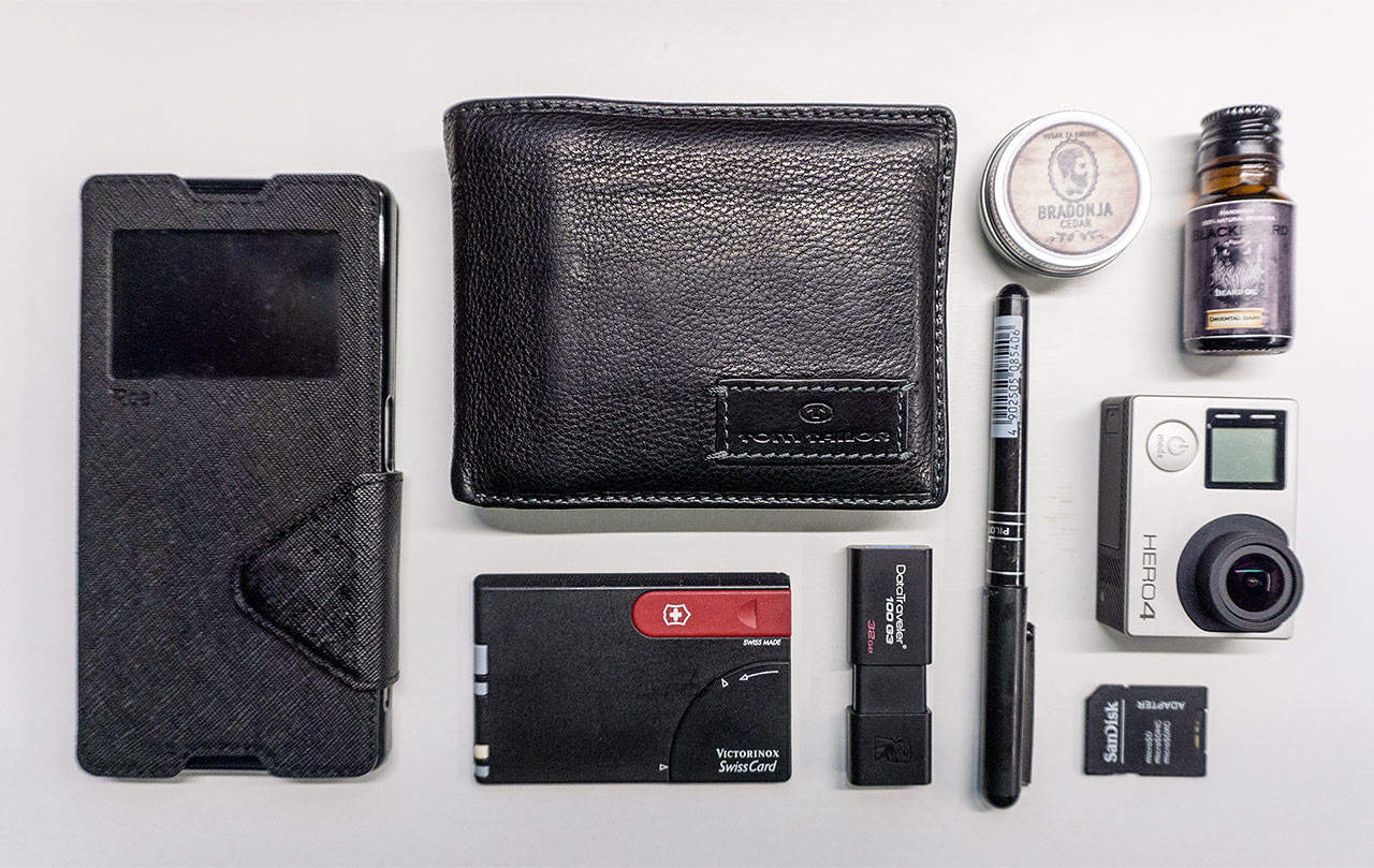 Uvijek je uz mene smartphone, biram nešto veće oblike poput Sony Z5, novčanik, klasika kožni Tom Tailor, Victorinox švicarska kartica, USB drive 32 giga, kemijska olovka obavezno iako se u Victorinoxu nalazi također jedna praktična kemijska olovka. Posljednjih godina uz mene je ulje za bradu i vosak za brkove jer nikad ne znaš kad će zatrebati, te praktičan i uvijek pouzdan GoPro Hero4, jer, opet, nikad ne znaš. SD adapter s rezervnom microSD karticom 32 giga za mobitel ili GoPro.