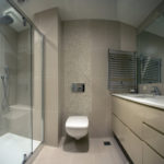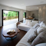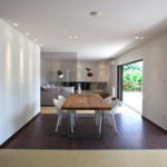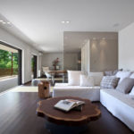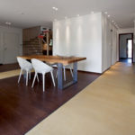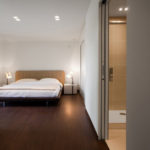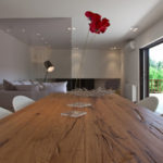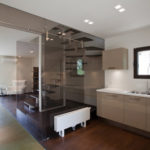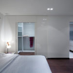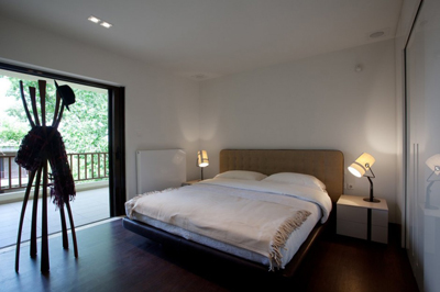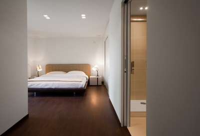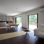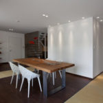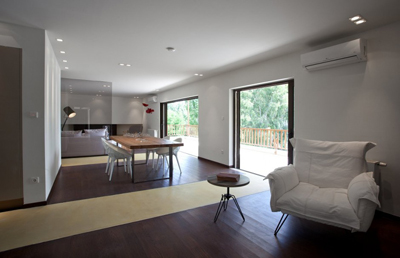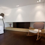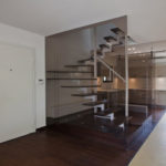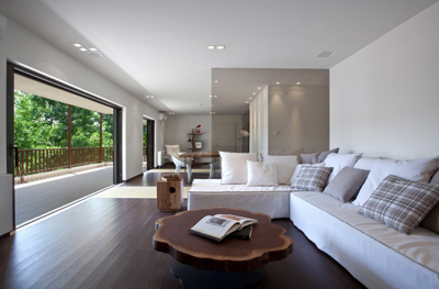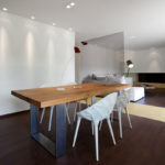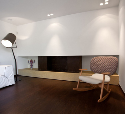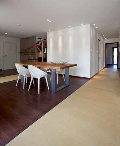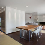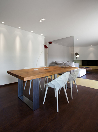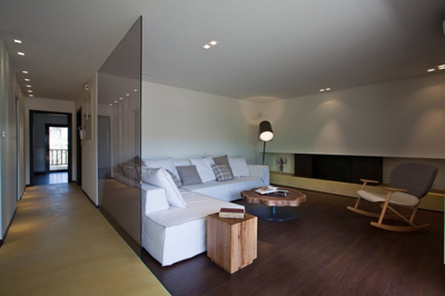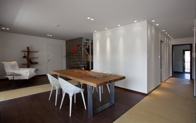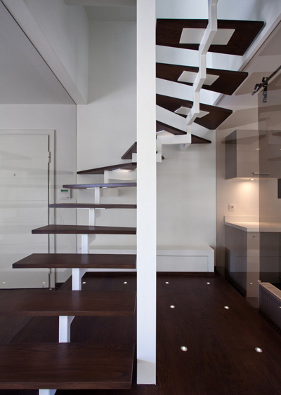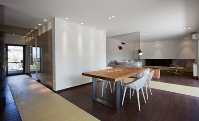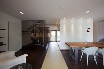 Stančina je izvedena moderno i vrlo jednostavno sa bijelom bojom kao dominantnom u koju je savršeno uklopljen spektar nijansi smeđe boje – od tamno smeđih i oker nijansi, do raznih drvnih dekora koji u interijer donose prirodnost. Interesantan je izbor ploča za stolove, a odlična ideja su pregradne plohe od smeđeg stakla. Svi komadi namještaja su pomno izabrani iz kolekcija tvrtke Casa di Patsi.