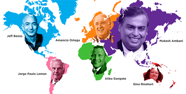 Prema Bloombergovoj listi milijardera tri najbogatije osobe svijeta dolaze iz SAD i to redom Jeff Bezos sa 10 milijardi dolara, slijede ga Bill Gates sa 89,2 milijarde te Warren Buffet sa 79,2 milijarde dolara. Na četvrtom je mjestu španjolski poslovni tajkun Amancio Ortega sa 75,9 milijarde, dok je peto mjesto rezervirano za Mark Zuckerberga.
